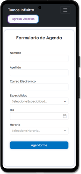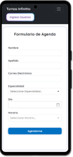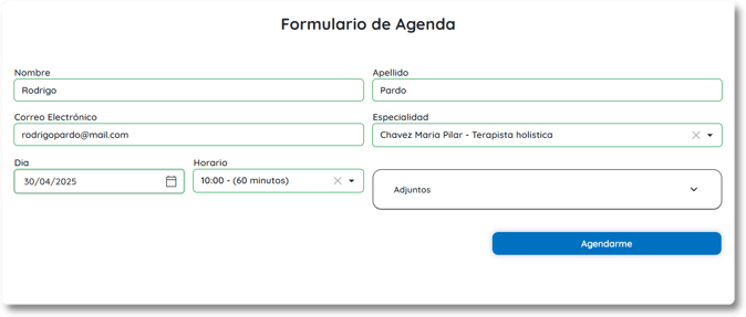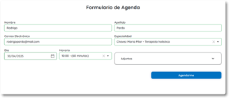 En la pantalla principal se encuentra el Formulario de Agenda, donde el cliente o paciente puede solicitar un turno. Allí podrá elegir una especialidad, si existiera, y la opción de adjuntar información relevante.