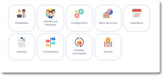 En este menú se pueden gestionar empleados, colegas, clientes y pacientes. Se pueden configurar las opciones de solicitud de turnos, visualizar el calendario, crear nuevos turnos, gestionar eventos recurrentes y clasificarlos. También permite ver el historial de cada cliente o paciente, con opciones para exportarlo o imprimirlo, y crear cronogramas personalizados con intervalos de descanso.