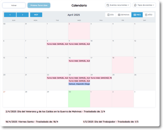 Desde esta sección podés crear nuevos turnos con facilidad, consultar disponibilidad, y tener visibilidad inmediata de días feriados o no laborables.