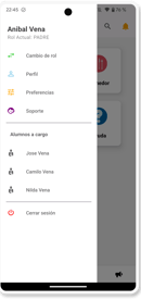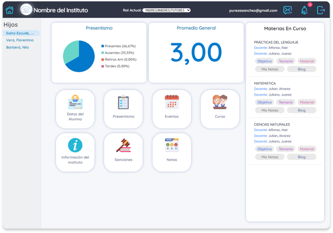 Los padres tendrán acceso a una vista rápida que les mostrará una lista de todos sus hijos que están cursando en el instituto. Esto les permitirá tener una visión general de los estudiantes y acceder rápidamente a la información de cada uno de ellos.