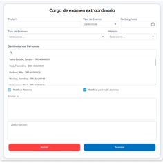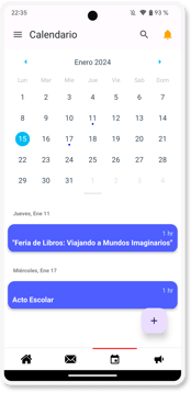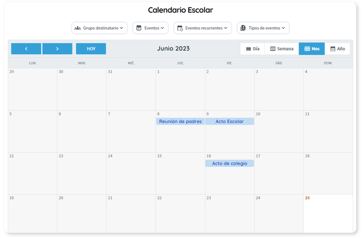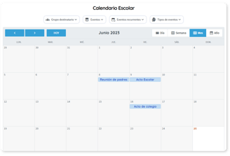 Desde este módulo se podrá gestionar el calendario escolar, incluyendo días hábiles, días no laborables, feriados y fines de semana. Además, se podrán crear eventos específicos, como exámenes, trabajos prácticos, actos escolares, entre otras cosas; tanto para padres como para alumnos. Se podrán crear grupos de destinatarios y programar eventos recurrentes.