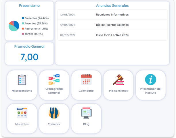 Dentro de este menú el alumno tiene la posibilidad de visualizar su presentismo y su promedio de manera general y detallada, tanto como sus sanciones.